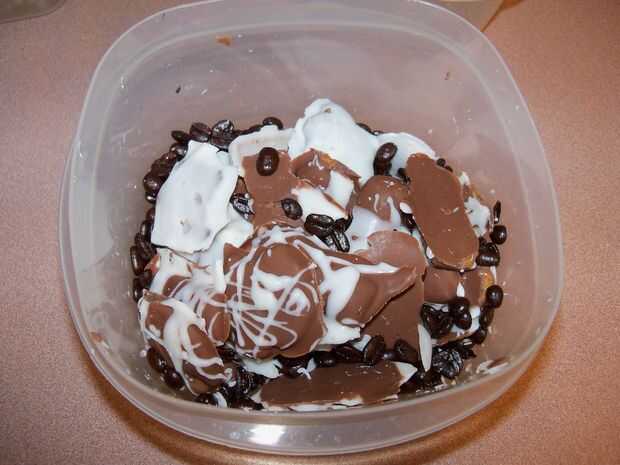 Por lo tanto, conseguir un par de envases tupperware y verter unos granos de café. Una vez las cookies en el congelador, romperlos aparte y ponerlos con el café, agitando el recipiente para mezclar todo. Les deje reposar toda la noche y el sabor ya habrá empezado a permear las galletas.