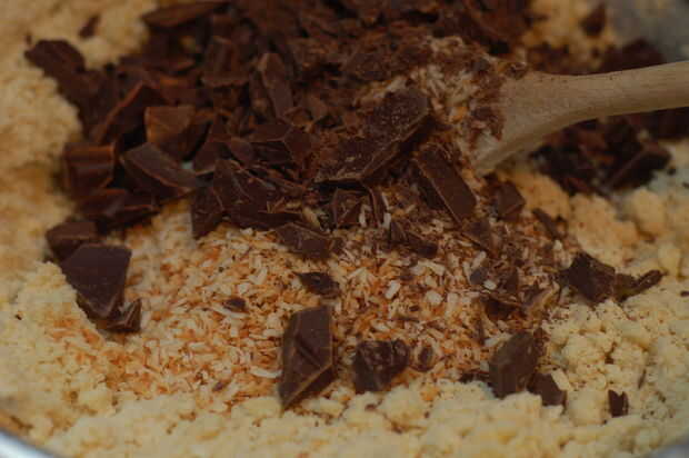Añadir el coco tostado y trozos de chocolate y mezclar suavemente, use sus manos para unir la mezcla en una bola de masa. Trate de no manejar la mezcla demasiado si no que terminarás con galletas duras. Si la mezcla no viene a añade un poco de mantequilla extra.