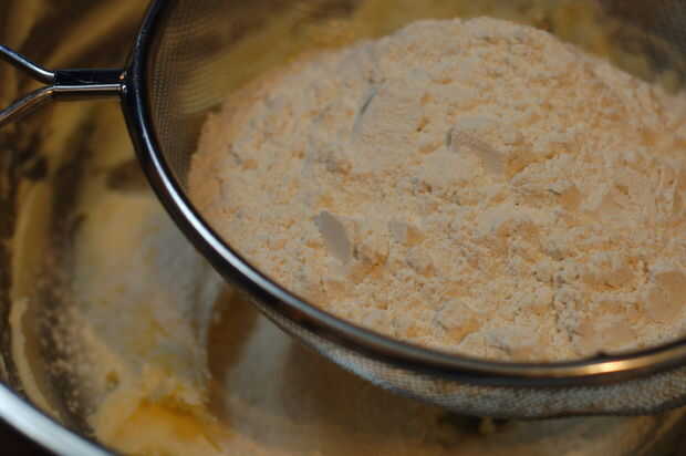 Tamizar la harina y arroz de tierra y mezclar hasta que la mezcla se asemeja al pan rallado.