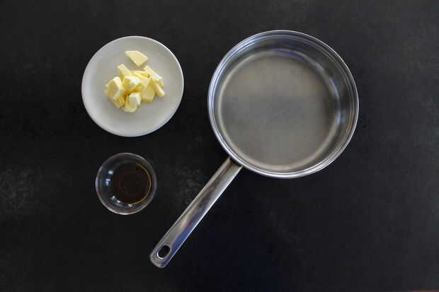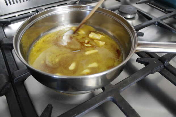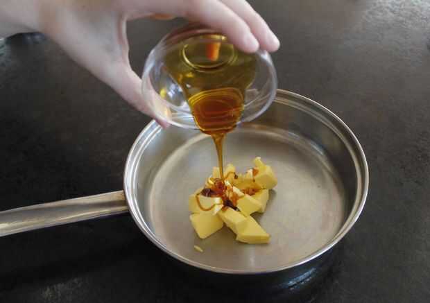 En una cacerola a fuego lento, derretir la mantequilla y el jarabe de oro.