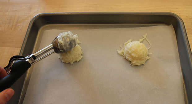 Usa un par de cucharas para formar bolas de la masa, más o menos de 1"(2,5 cm) de diámetro. Ponlas en unas bandejas de horno, cubiertas con papel de pergamino (o, engrásalas modelo para las galletas no se peguen).