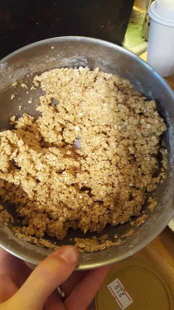 Primera cosechadora 1/2 una taza de mantequilla con 1/3 taza de azúcar morena y azúcar blanca 1/3 taza Batir hasta que quede suave. Añadir 2 huevos y 2 cucharaditas de vainilla. Batir hasta incorporar. A continuación, agregue 1 1/2 tazas harina, 2 1/2 tazas de avena y 1 1/2 cucharadita de polvo de hornear y una pizca de sal. mezclar bien.
