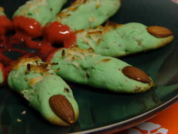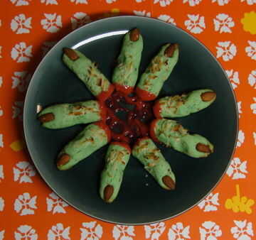 galletas de dedos de bruja muchos escupitajos yummy será el éxito de su mesa de Halloween!Son rápida y fácil cuando empiezas con tienda comprar masa para galletas. (Si quieres hacerlos de cero, utilice una receta de galletas de azúcar para las galle