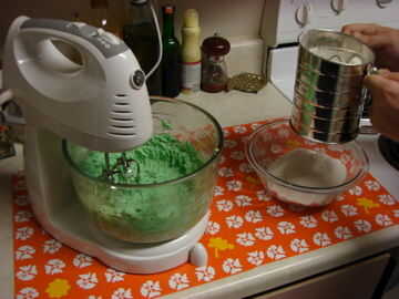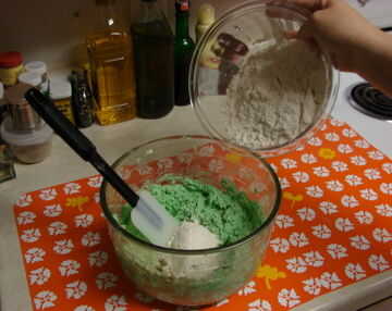 Precalienta el horno a 350 grados. Crema mantequilla y el azúcar hasta ligero y mullido. Añadir huevo y yema de huevo, vainilla y coco Extracto de huevo. Mezclar bien. Agregue las nueces y colorante alimentario verde. En un recipiente aparte, cierna la harina, polvo de hornear y la sal. Agregue la mezcla de harina a la mezcla de crema. Remover para mezclar bien.