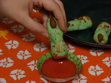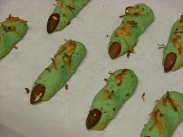 galletas de dedos de bruja muchos escupitajos yummy será el éxito de su mesa de Halloween!Son rápida y fácil cuando empiezas con tienda comprar masa para galletas.  (Si quieres hacerlos de cero, utilice una receta de galletas de azúcar para las galle