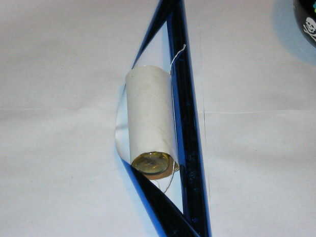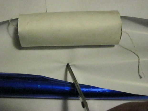 El siguiente paso es empujar las cuerdas por los agujeros con la punta de la tijera o palillo de dientes o algo. Una vez que las cadenas son a través de sus respectivos agujeros, cinta adhesiva un extremo del papel en el tubo, envolver firmemente el otro extremo alrededor y en su lugar como la cinta.