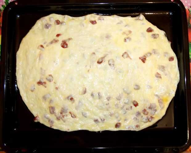Una vez la masa ha con levadura, extender el aceite de oliva en una bandeja para horno y poner la masa en él, presionando con las manos hasta que llegue a los lados de la lata para hornear y obtiene más fino.