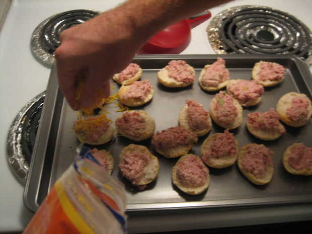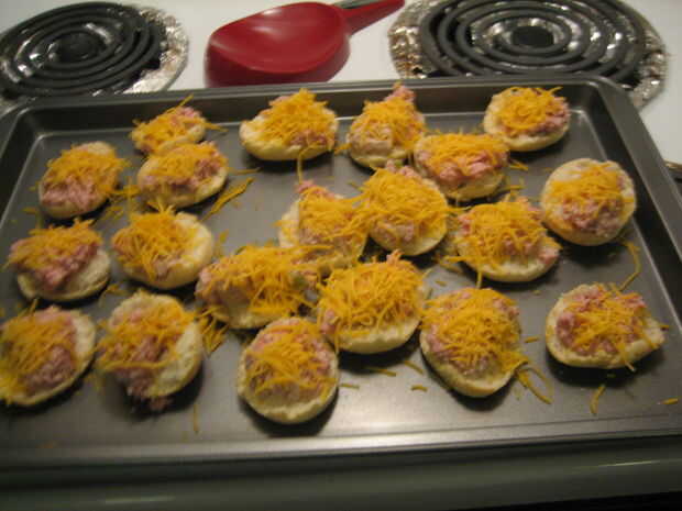 Tomar el cheddar rallado queso y difundirlo en ahorrar cantidades sobre las galletas con jamón sobre ellos.  El queso debe cubrir las galletas pero no debería ser una torre de queso sobre cada uno.  Ver cuadro 2 para la referencia.