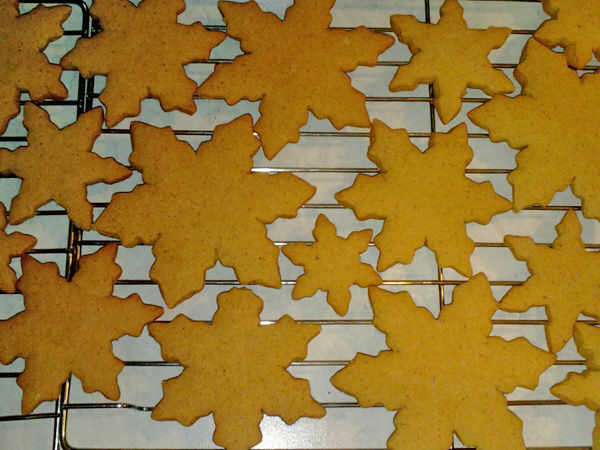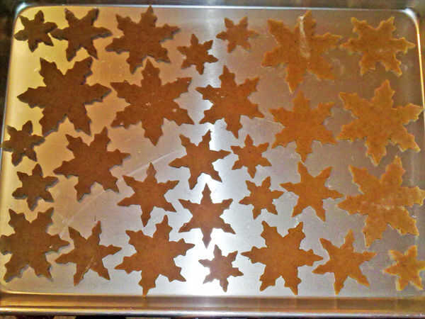 Después de cortar las formas, retire con cuidado los alrededores "desechos" y luego levante cada galleta suavemente con una espátula tipo herramienta y transferencia para hornear engrasada. Deje aproximadamente 1/2 pulgada de espacio entre las galletas y los bordes de la bandeja para hornear galletas.