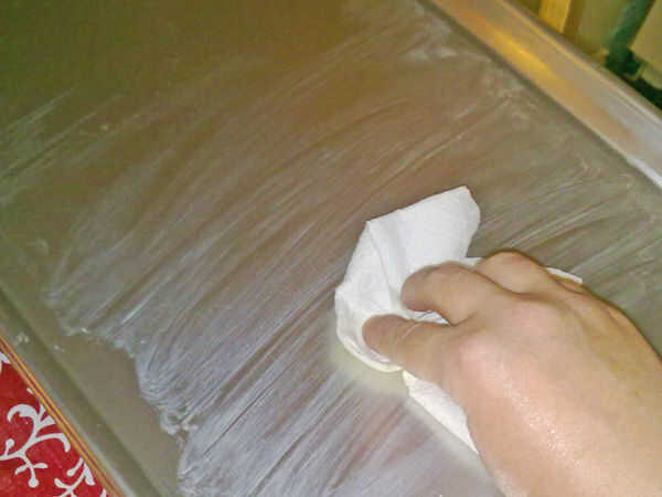 Engrasar la hoja de galleta con mantequilla, margarina o aerosol de cocina antiadherente. Esparcir uniformemente con toalla de papel. Ponga a un lado.