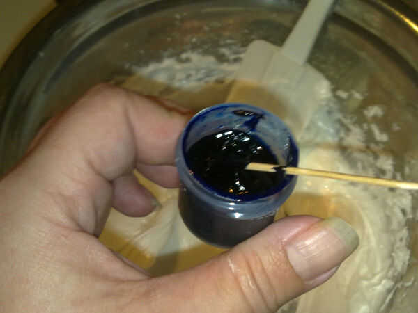 Si usted quiere algunos de su glaseado de color, añadir una pequeña cantidad de gel (o líquido) colorante a una porción de su azúcar. Mezclar con la batidora hasta logra el tono deseado. Transferencia de color guinda de Manga pastelera. Cubrir cualquier formación de hielo sin usar.