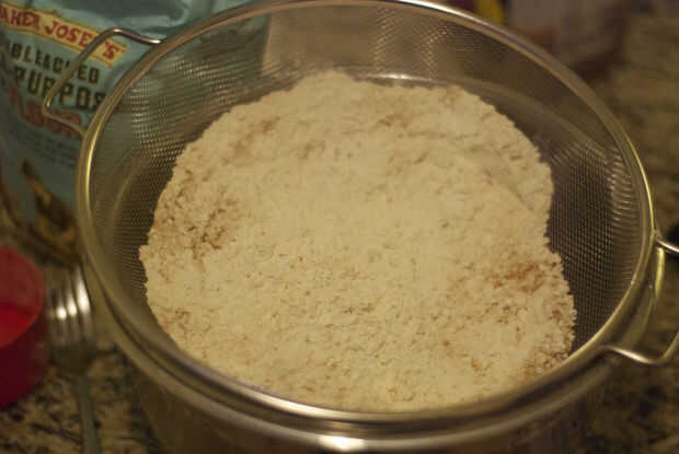 Cierna harina, jengibre, canela, clavos de olor, bicarbonato, nuez moscada y sal en un tazón grande. (Si no tienes un lujo harina tamiz - no dude en utilizar un colador de malla fina!) Revuelva con un tenedor para combinar bien.