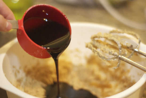 Usando una batidora eléctrica, batir la margarina, mantequilla, azúcar moreno y azúcar blanco en alto hasta la luz y mullidas. A continuación, batir en huevo, manzana sidra (o OJ) y melaza. Batir todo a mano o con la batidora hasta que quede suave y bien mezclado.