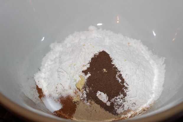3. en un bol grande añadir seco ingredientes-harina, bicarbonato, canela, pimienta de Jamaica, jengibre, mostaza de tierra y sal.
