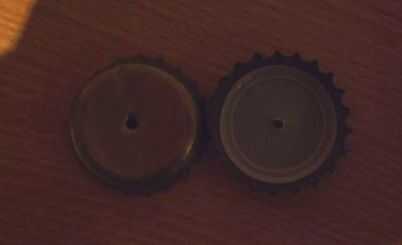 Con un martillo y un clavo, hacer un agujero en el centro de cada tapa de aluminio. Entonces martillo plano. ¿He intentado conseguirlos tan amplia como sea posible, con todos los bordes doblando hacia fuera porque se ve mejor y tal vez da un sonido mejor para...? También intentó eliminar la capa de plástico en el interior, que era más fácil en algunas marcas que otras.