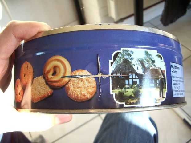 Para hacer 6 agujeros uniformemente espaciados, medir el radio de la lata de galletas y mirar aquí. Sorteo 6 de ancho se cruza en el borde de la lata. Las cruzas deben ser ligeramente más anchos que un casquillo de aluminio aplanado.