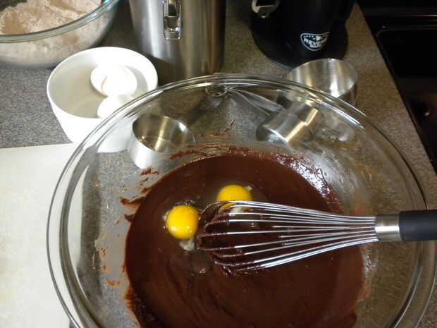 Una vez el chocolate y la mantequilla están suave, retire el tazón de fuente de calor; batir en azúcares y huevos, hasta que quede suave.