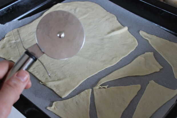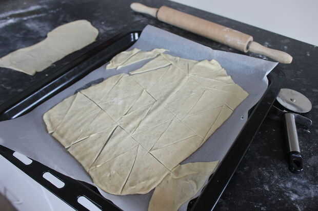 Utilice un cuchillo muy afilado o un cortador de pizza para cortar las hojas de masa en triángulos, o cualquier forma tu corazón desea. Incluso puede saltarse este paso, cocer en una hoja y apenas romper piezas después de su cocido y enfriado, estilo rústico.