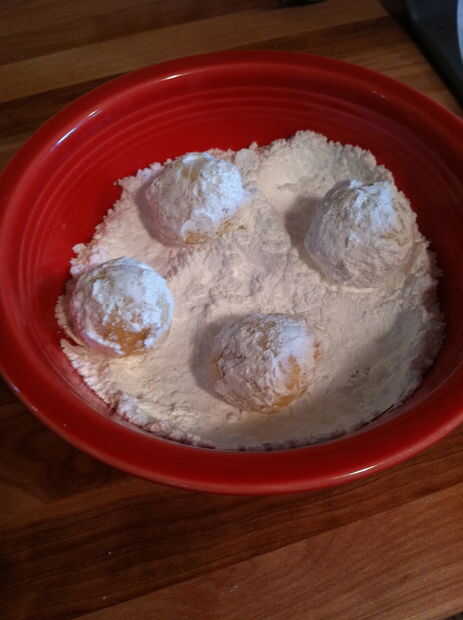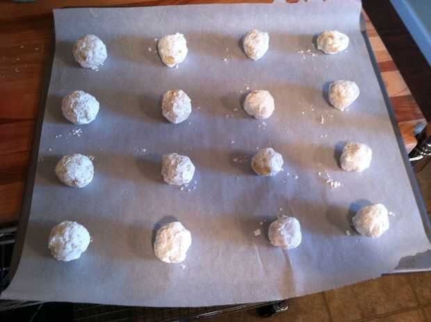 -Rodar las galletas cucharada tamaño bolitas. Hizo un poco más pequeño que normalmente haría galletas. -Rodar las bolas de masa en azúcar en polvo antes de colocar sobre la bandeja para hornear. -No presione hacia abajo las bolas antes de hornear, esto podría provocar que se difunda demasiado. -Cueza al horno para 9-11 minutos.
