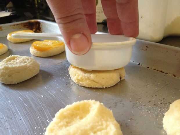 El lugar uno el de limón cocido rodajas sobre cada masa de la bola y utilice el fondo de una taza para aplanar las galletas un poco más y presione la rodaja de limón en la masa. No aplanar demasiado la masa; una buena pauta es para no aplanar la masa para ser más grande que la rodaja de limón.