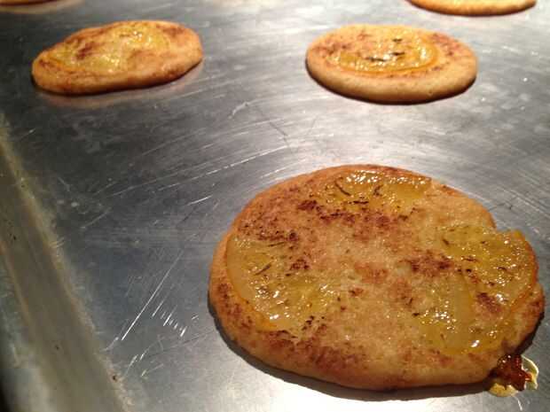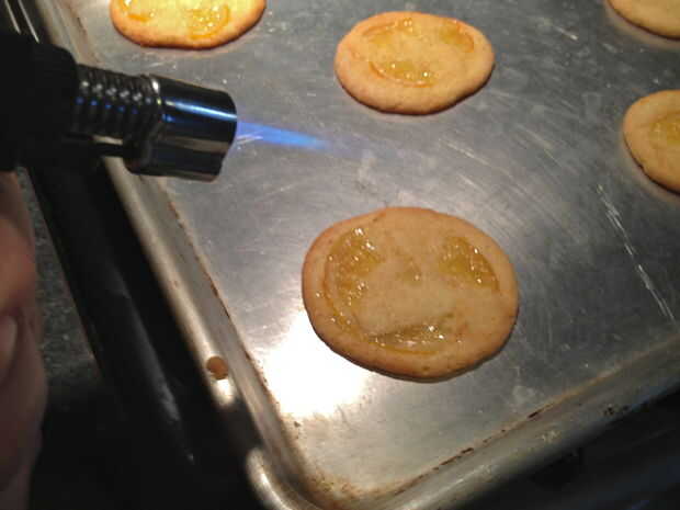 Un compañero de trabajo me trajo 20 limones de meyer de su árbol y me he estado divirtiendo convirtiéndolos en diferentes cosas deliciosas. Hoy ha sido un simple cuajada de limón. Moteados en galletas de mantequilla pequeño y cubierto con hojas de to