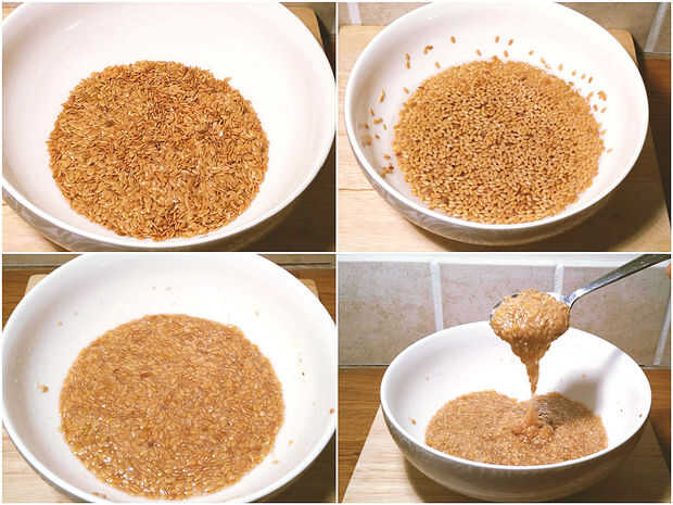 2. Mezcla de agua, sal, semillas de lino y remójelos durante 15 minutos o hasta que tenga una consistencia pegajosa - ver imagen.