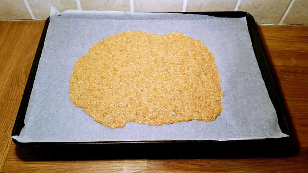3. Entonces lisa mezcla sobre papel sulfurizado y hornear durante 10-15 minutos hasta crujientes.