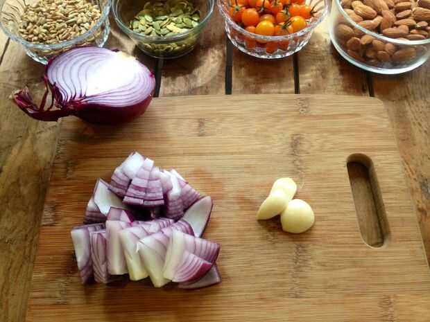 Ingredientes200g tomatitosUn cuarto de un pimiento rojo, picadoUna babosa de aceite de olivaPimienta negraUn puñado de albahaca, finamente picada50g de queso de parmesanoLa mitad un diente de ajo2 huevos de León británicoMasa madre para servirMétodo1