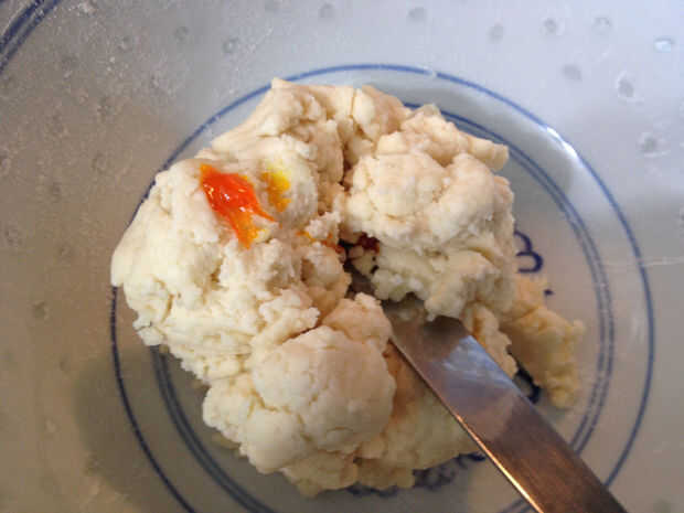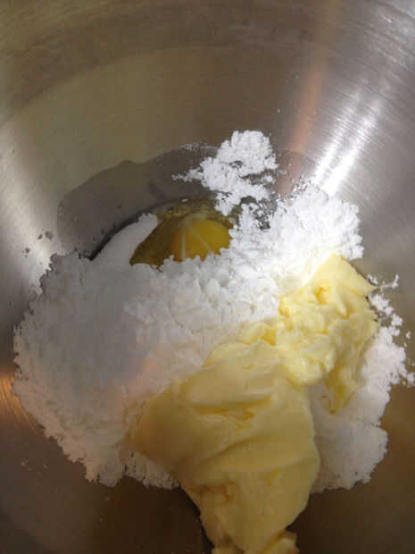 Coloque el huevo, la margarina y el azúcar glas en un recipiente mezclador, Agregar colorante y batir para combinar (si no tienes un mezclador, no se preocupe, cuchara de madera trabajaría demasiado)