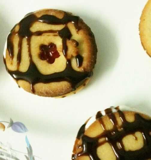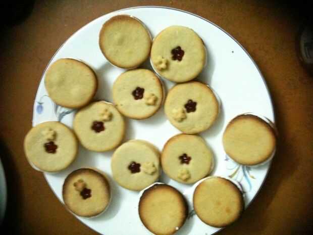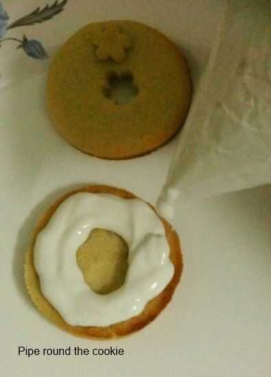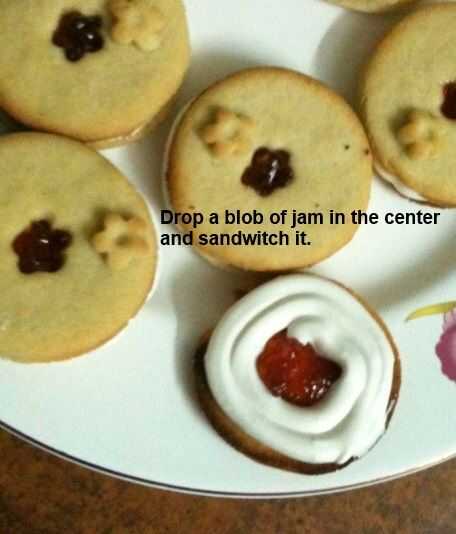 La melcocha de la pipa en un círculo y luego coloque una gota de mermelada en el centro... luego colocar la cookie abierta corte en tapa y presione.