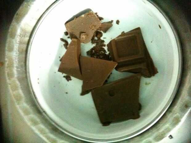 Para hacer su ebullición doble casera... colocar una olla con agua llenado hasta cuarto... Coloque la otra olla sobre el primer pote para que no toque el agua y también cubre la boca de las falencias de puño... así... cuando el vapor no se escape... es más rápido derretir el chocolate.