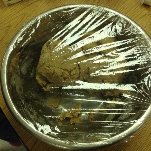 A continuación cubra el tazón en plástico y meter en el frigorífico. El mínimo tiempo para la masa de enfriamiento es de 1 hora, pero fue nuestra masa en la nevera durante la noche.
