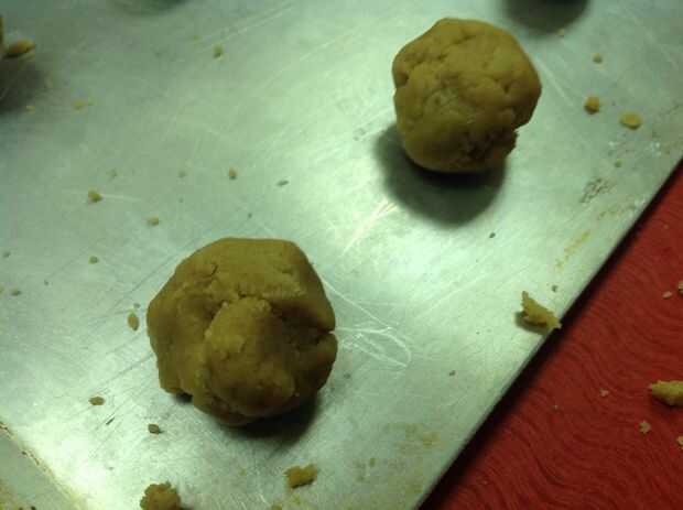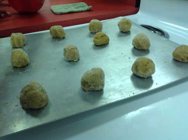 Dividir la masa en 24 bolas y coloque en dos moldes para galletas. Luego tomar tus 2 cucharadas de azúcar y poner en un cuenco. Luego, gire suavemente cada bola para ser cubierto en azúcar y vuelva a colocar suavemente en la hoja de galleta.