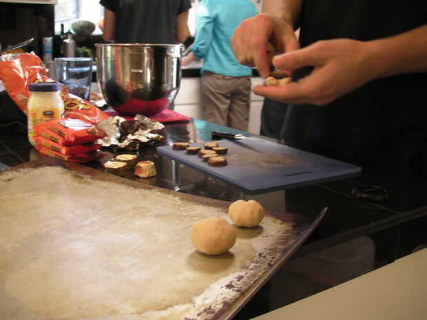 - Coloca media taza mantequilla de maní entre las dos mitades de masa.