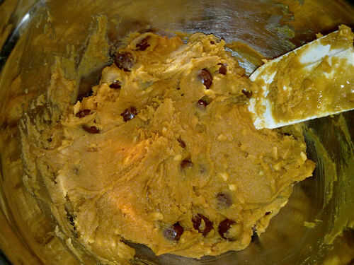 En un tazón, combinar la mantequilla de maní, azúcar y huevos. Mezclar bien. Doble Chocolate cubrió las pasas de uva hasta que distribuye.