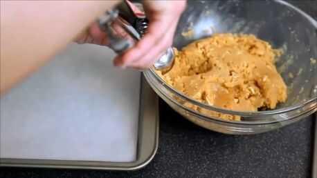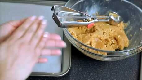Después se mezcla con masa de galletas, usé una cucharada pequeña para hacer mis porciones de galletas. Usando una bola realmente ayuda a hacer porciones iguales y como resultado las galletas toman vez para terminar la cocción. Si no tienes una bola, puede utilizar dos cucharas de té para hacer el trabajo.