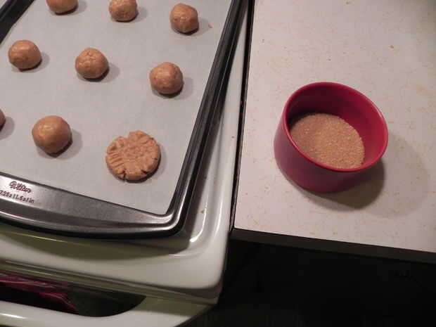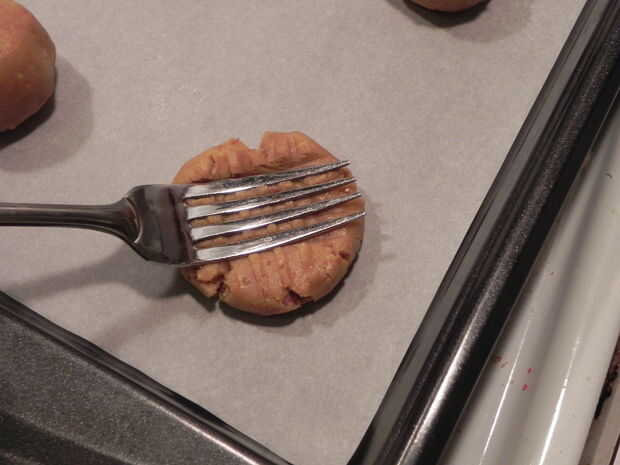 Sumerge un tenedor en el agua y presione los dientes en un patrón de x a través de la cookie de prensado plano como lo hace.