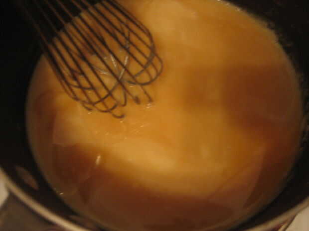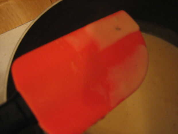 7. Continuar batiendo hasta que la mezcla empiece a espesar - tardará aproximadamente 7 minutos. Cuando la mezcla cubre la parte posterior de una cuchara y ocupa su lugar al dibujar su dedo a través de él, es lo suficientemente gruesa