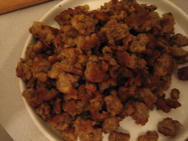 1. Sobre fuego medio alto, calienta suavemente las migajas de la salchicha hasta que esté caliente a través de (3 minutos)