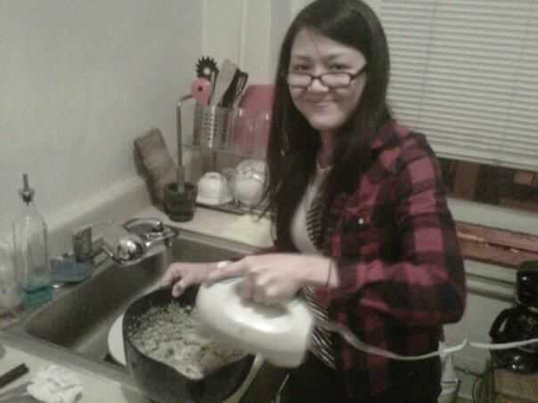 1.) primera mezcla aguacate, mantequilla y plátanos. Uso de batidor para plátanos adecuadamente se mezclan con la mantequilla de coco. Luego agregar azúcar, harina y un paso en un momento. La mezcla entre cada adición. Luego agregar el resto de los ingredientes excepto el aceite vegetal. Nos dimos cuenta después de que deberíamos haber salteado la manzana primero pero la manzana debe ser su última adición. Todavía vino bien pero creemos que el sabor hubiera sido más fuerte si nos habíamos salteado primero.