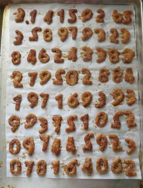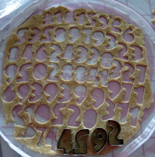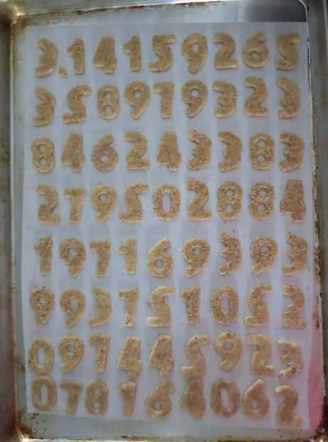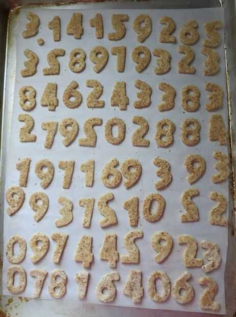 Cortar en formas deseadas, para el día de Pi que recortar tantos números de pie como tenía espacio en la bandeja para hornear. Empanada masa tiende a endurecer con el balanceo, por lo que sólo rodaría los desechos adicionales una vez más para conseguir más galletas. Coloque los cortes en una placa para horno forrada con. Refrigere o congele, unos 20 minutos a firma para arriba.