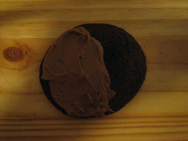 2. Voltee cada galleta y usando los pequeños cuchillos o espátulas, cubren la mitad de la base de cada galleta con el glaseado de chocolate y el otro con hielo llano