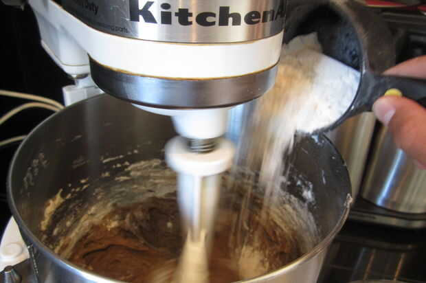 Verter los ingredientes secos mojados ingredientes en la batidora con base. Mezclar hasta que quede suave.