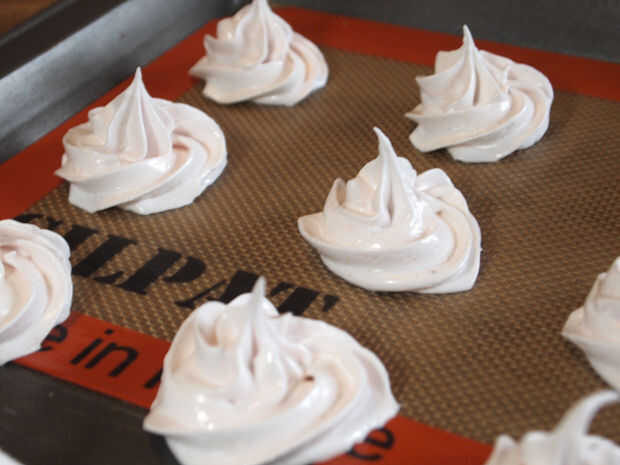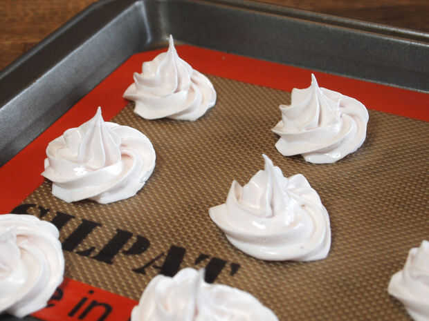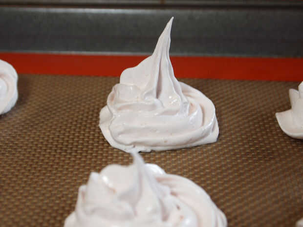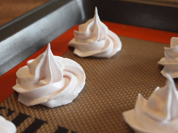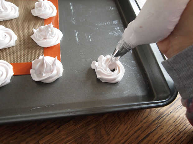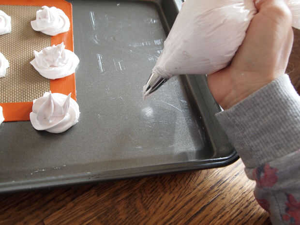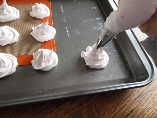 Ahora para la divertida parte. Usted tubo o plop a tus galletas de merengue. Si plopping, puede usar algo como una cuchara de helado (al parecer esto no es una palabra - scoop) - para sacar el merengue y luego usar otra cuchara para sacar con pala hacia fuera. Colóquelos cerca de dos pulgadas aparte en la hoja de galleta.