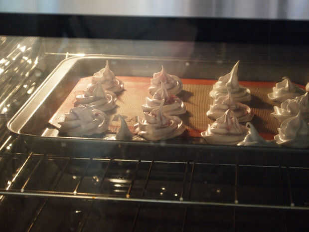 Hornear los merengues de 40-50 minutos, o hasta que fácilmente puede elevarlos en el papel de pergamino. Luego, apague el horno. Algunas personas luego romper la puerta del horno y dejan allí durante una hora. O puede dejar cerrada la puerta del horno y dejarlas allí durante una hora o incluso durante la noche. Depende de usted. Es tan seco en nuestra casa que apaga el horno, dejó abierta una grieta durante unos 30 minutos, entonces probó uno. Crujiente, luz, airy y delicioso! Hubo un poco de consistencia en el interior (unos aman, otros no). Así que un par de horas más tarde, abrí el horno (mi hijo robó la mayoría de ellos en ese momento que se habían ido) y uno otra vez - todo crujiente y luminosas a lo largo. Me encantan estas galletas!
