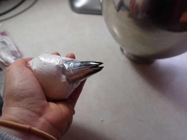 O, puede utilizar una manga pastelera (o cualquier ziplock o bolsa sándwich claro) y usar una punta de la tubería para ayudar a crear diseños bonitos o únicos para las galletas. Me daba pereza usarlo la manera correcta - así que pongo esto en una bolsa de sandwich, corte un pequeño agujero en la esquina y funcionó muy bien!