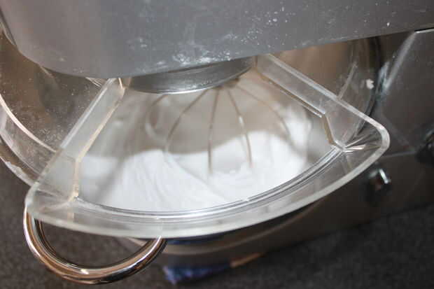 Batir las claras de huevo en un recipiente de vidrio o metal. Cuando las claras están casi tiesas añadir el cremor tártaro y por ir superando. El añadir lentamente el azúcar, en ir superando. Utilizar la máquina Kenwood o bien mi brazo se caiga.