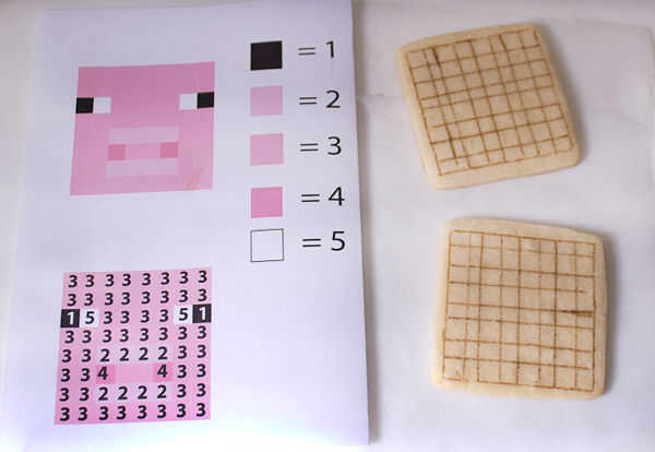 Utilizando la plantilla impresa como guía, cumplimentar todos los cuadrados marcados con #1 con glacé real negro. Antes de la formación de hielo, puede que desee marcar las casillas con su colorante marcador para ayudar a prevenir errores. Completar este paso en todas tus galletas de Minecraft de cerdo y deje la guinda un poco seco antes de pasar al siguiente color.