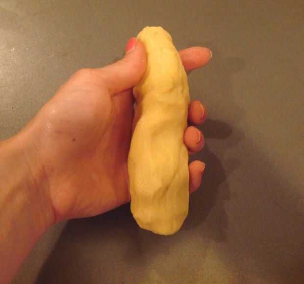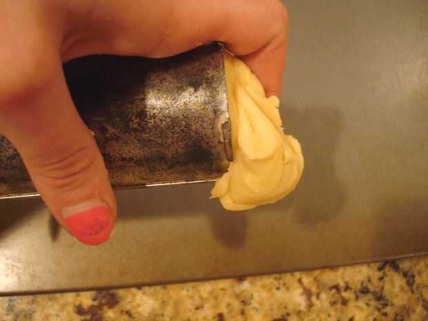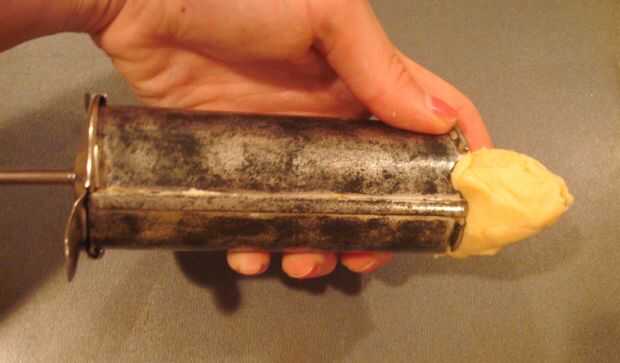 Para llenar la cookie press toma un puñado de masa y rodar en la palma de las manos por lo que parece una serpiente. Esto le ayudará a él fácilmente deslizante en el tubo de la prensa de galletas. Una vez que la masa (y no el final) Coloque el accesorio estrella en la parte superior y fijarlo con el anillo frontal.