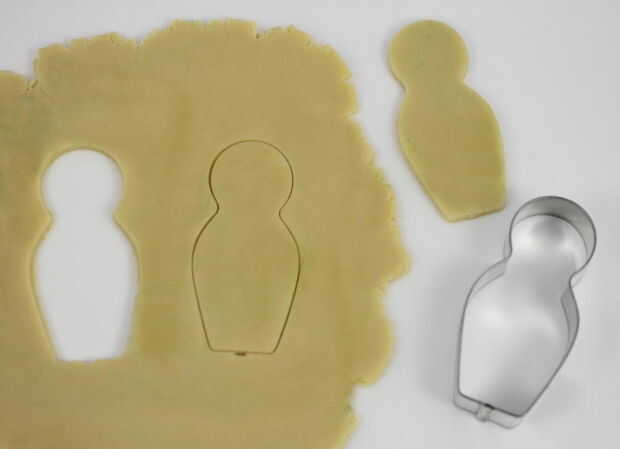 Cortar las galletas con el cortador de la galleta de matryoshka y coloque las galletas sin hornear en bandejas preparadas.